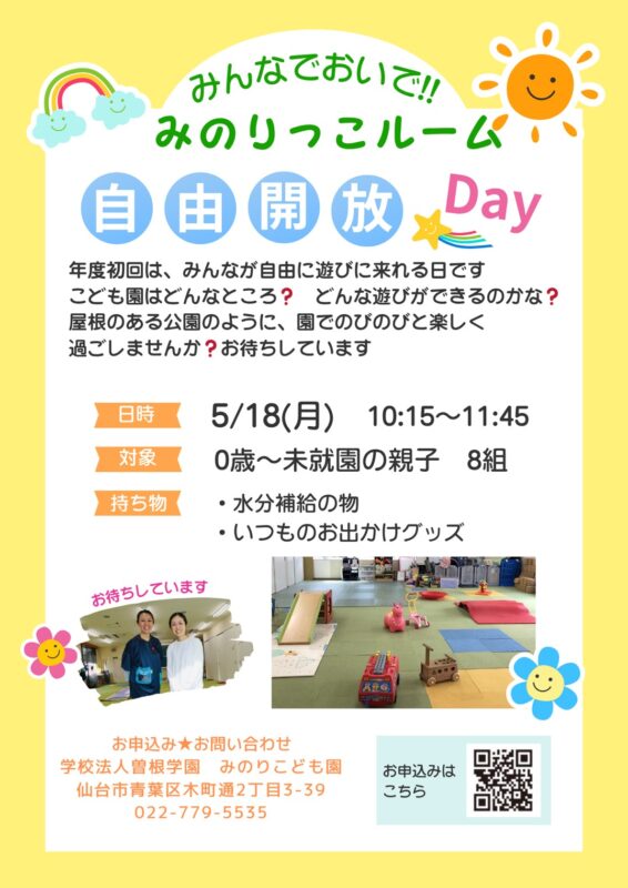 5/18(月)みのりっこルーム自由開放Day 受付中 今年度最初のみのりこども園子育て支援みのりっこルームは、みんなが自由に遊びに来れる【みんなおいで‼みのりっこルーム 自由開放Day】となっております♪ 屋根のある公園だと思って、お気軽にお申込み&ご来園ください♪ みなさんとお会いできることを楽しみにお待ちしております♡ お申込はこちら 前の記事へ 一覧へ